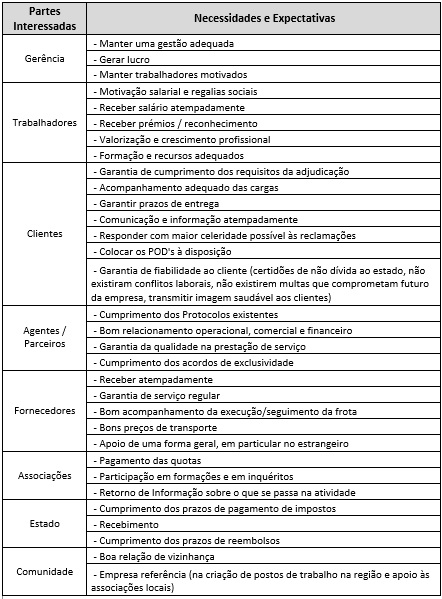 Após identificadas as Partes interessadas por parte da Lusocargo (Sul), foram ainda levantadas as Necessidades e Expetativas das mesmas face à nossa empresa.
